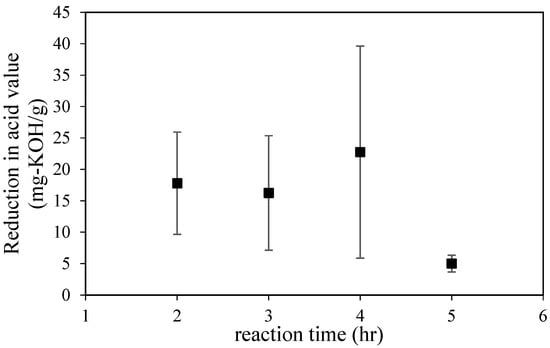 According to the resulting data for 2–4 h, the rate of acid value reduction was around 6.6 mg per KOH.g−1/h. In contrast, after 4 h of reaction, the reduction rate was 33 mg per KOH/h, which is the optimum value for acid reduction. Furthermore, as mentioned above, the side products of maleic anhydride might contribute to the acid value. As shown in Figure 2, the substantial drop in acid value occurred until 4 h of reaction time; straightforwardly, this result also shows that side-products (other acids from hydrolyzation of maleic acid) might be diminished after 4 h of reaction. The result is similar to the previous result that mentioned that the optimum conversion of abietic acid to levopimaric acid occurred when the reaction time was more than 1 h. However, after a longer reaction time, the ester formation was smaller.