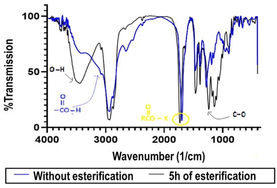 In order to ensure that esterification occurred, the raw rosin and spectra of the treated rosin were analyzed using FTIR, as shown in Figure 3. Figure 3 compares the spectra of gum rosin before and after 5 h of reaction using a ratio of rosin to glycerol of 1:3. The main differences are the presence of new wavenumbers at 1700–1725 cm−1 and 1735–1750 cm−1, which correspond to the carboxylic and esters groups, respectively. Interestingly, the new wavenumber also occurred at 3400–3600 cm−1, which is known as O-H stretching. The O-H bond might be a result of the unreacted glycerols placed in a solution of treated pine rosin. Also, the O-H bond might be an effect of the presence of water as a by-product in the esterification process. Moreover, the O-H bond could be evidence of the presence of glyceryl 1-monoabietate as the product stemming from either the esterification of abietic acid with glycerol [24] or the O-H bond of the modified esterification product created via the Diels–Alder reaction.