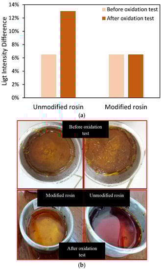 (a) Light intensity differences between rosin before and after the oxidation test; (b) rosin’s appearance before and after the oxidation test.