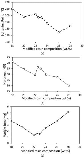 In addition, Figure 5c illustrates weight loss as an assessment for homogeneity and compatibility between the rosin and blending materials. The lowest weight loss occurred when the rosin composition was between 22 and 23 wt.%. In comparison, when the unmodified rosin paint was evaluated using the same method, the weight loss from the wear resistance test was 8.6 mg/kg, while that of the modified resin was only 1.33–5.12 mg/kg. Compared to conventional paint, the weight loss of paint from 22–23% rosin was near to or almost the same (1.33 to 1.56 mg/kg) as that of the conventional paint (1.51 mg/kg).