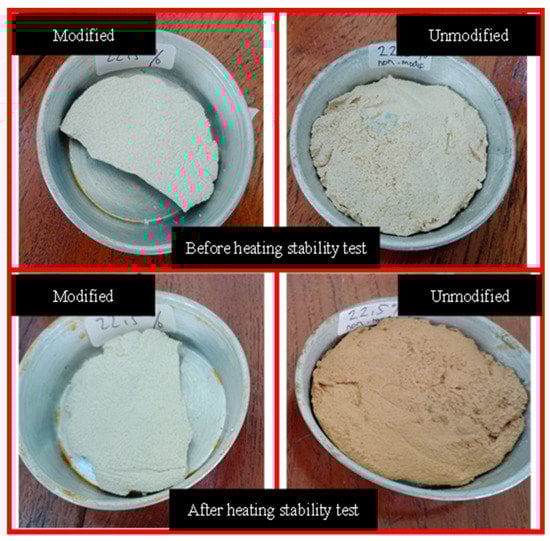 In brief, considering the performance test, the 22.5% modified rosin version was chosen as the best result, since the characteristics were almost the same as those of conventional paint. The characteristics of 22.5% modified rosin paint, 22.5% unmodified rosin paint, and conventional paint are described in detail in Table 1. The table presents a comparison between the quality of road marking paint using modified rosin and unmodified rosin at the same content (22.5 wt.%) as that of the paint’s binder. The results demonstrate that the softening point of the modified rosin paint is higher than that of the unmodified paint, which is attributed to the Diels–Alder reaction between rosin ester and maleic anhydride [17]. Maleic anhydride is known to be a softening point improver material. Additionally, the hardness of the modified rosin paint is higher than that of the unmodified paint, and the modified rosin has a hardness closer to that of the conventional product. Moreover, the weight loss of the modified rosin paint in the wearing test is comparable to that of the conventional product. Furthermore, Figure 6 presents a comparison between the heat stability tests of the modified and the unmodified rosin paints. The figure reveals that the modified rosin paint is more stable, since its color is not significantly influenced by heating.