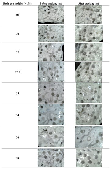 Based on the results presented in Figure 7, it can be concluded that all versions of the road marking paint were able to withstand heating at 150 °C for 24 h without exhibiting any cracks. This result indicates that the interaction between the binder and blending materials was compact [5] and able to withstand high temperatures, making it suitable for use in hot climates. Additionally, Figure 7 confirms there were no defects observed in the road markings, as well as that the glass beads were effective in providing reflectivity. Overall, the modified pine rosin binder demonstrated versatility across different rosin compositions, further highlighting its potential as a reliable binder for creating road marking paint.