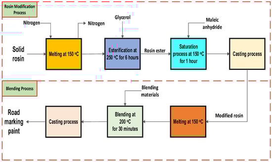 The use of thermoplastic paint is one potential approach to producing road marking paint, as it is a relatively low-cost product and is easy to use compared to cold-plastic materials. Furthermore, thermoplastic is highly durable, with constant retro-reflectivity compared to other paint types [13,14,15,16]. However, it does require more energy to heat and is sensitive to air temperature [15,16]. Rosin, including pine (Pinus merkusii)-based rosin, can be used as a thermoplastic marking paint binder. This environmentally friendly and sustainable material is widely available in Indonesia, China, and Brazil [17,18,19]. In addition, pine rosin is commonly used as an antibacterial agent, ink toner, paint, and coating [19,20,21,22,23,24,25,26]. Given its versatility and renewable source, rosin has great potential as a renewable and sustainable binder in road marking paint. Nonetheless, pine-based rosin suffers from several drawbacks, including a lack of oxidation stability, high acid value, and poor durability [23,24,27,28], due to the carboxylic acid content in pine rosin. Therefore, additional chemical treatments are necessary to equip pine-based rosin with highly durable properties.