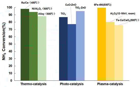 To produce clean H2, various technologies have been developed, such as thermocatalytic NH3 decomposition, photocatalytic NH3 decomposition, plasma-catalytic NH3 decomposition, and electrocatalytic NH3 decomposition. Figure 2 shows the advantages and disadvantages of each method [10,11,13,14,15,16,17,18]. Understanding these methods is key to determining the current capabilities of the NH3-to-H2 conversion technologies. Figure 3 compares the performance of various technical methods for ammonia decomposition. The results were obtained under different conditions, enabling a thorough evaluation of the effectiveness of each approach [10,19,20,21,22,23,24,25]. Further discussion has been explored regarding the benefits and drawbacks of each approach below.