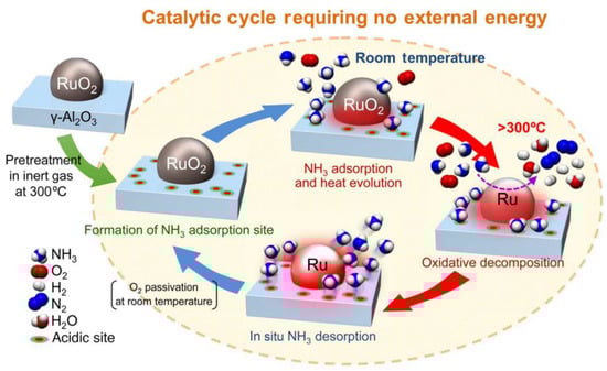 Katsutoshi Nagaoka et al. studied hydrogen production using an acidic RuO2/γ-Al2O3 catalyst by exposing ammonia and O2 at room temperature, as shown in Figure 5 [50]. The exothermic adsorption of ammonia on the catalyst causes the catalyst bed to rapidly heat up to the auto-ignition temperature of catalytic ammonia, resulting in the oxidative decomposition of ammonia to generate hydrogen. A differential calorimeter and a volumetric gas sorption analyzer were used in the study to measure the heat released by the physisorption of multiple ammonia molecules and the chemisorption of ammonia onto both the RuO2 and acidic sites on the γ-Al2O3. The results showed a significant amount of heat evolved during both processes.