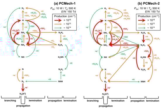 Schematic of the primary chain reactions for (a) PCMech−1 and (b) PCMech−2 for the NH3/N2 combination (1/99 mol%) with Tg = 500 K, E/N = 150 Td, and Pdis = 10 W. (reproduced with permission from [62], Copyright American Chemical Society, 2023).