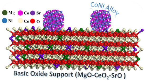 Schematic illustration for the decorated CoNi alloy on the oxide support of MgO–CeO2–SrO (reproduced with permission from [49], Copyright Royal Society of Chemistry, 2022).