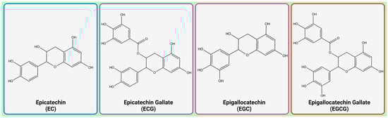 Chemical structure of epicatechin (EC), epicatechin-3-gallate (ECG), epigallocatechin (EGC), and epigallocatechin-3-gallate (EGCG). Created with BioRender.com, accessed on 29 March 2023.