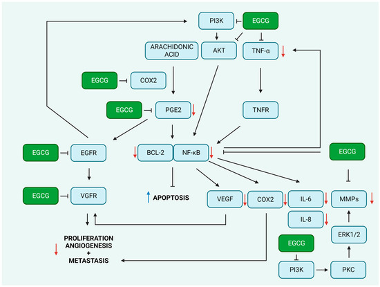 The molecular basis of the anticancer mechanism of action of epigallocatechin-3-gallate (EGCG) related to the suppression of inflammation. Cyclooxygenase 2 enzyme (COX2) catalyzes the conversion of arachidonic acid to prostaglandins (PGEs), including PGE2. PGE2 stimulates the expression of anti-apoptotic BCL-2 protein and the nuclear factor NF-kappa-B (NF-κB)-mediated gene expression of vascular endothelial growth factor, interleukins (IL-6 and -8), matrix metalloproteinases (MMPs), and COX2. EGCG was shown to act as a COX2, PGE2, NFκB, and MMPs inhibitor, suppressing the angiogenesis and metastasis of cancer cells and enhancing apoptosis induction. Additionally, EGCG may work as phosphoinositide-3-kinase/RAC-alpha serine/threonine-protein kinase (PI3K/AKT), epithelial growth factor (EGFR), and vascular endothelia growth factor, which control NF-κB and MMPs activity and expression and confer enhanced proliferation, angiogenesis, and metastasis. Furthermore, EGCG treatment may down-regulate the expression of tumor necrosis factor α (TNF-α) and suppress the activation of tumor necrosis factor receptor (TNFR) signaling. For full protein names, see the abbreviations section. Red arrows indicate down-regulation of the protein expression or its inhibition. Created with BioRender.com, accessed on 29 March 2023.