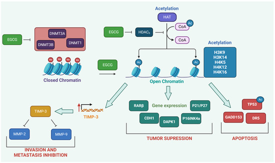 The modulation of epigenetic targets by epigallocatechin-3-gallate (EGCG). Methylation of CpG islands and histone proteins works as a mark that confers the closed chromatin formation and transcriptional suppression of genes encoding proteins involved in tumor suppression, invasion and metastasis inhibition, and apoptosis induction. EGCG down-regulates and inhibits the activity of DNA methyltransferases (DNMT1, DNMT3A, and 3B) that introduce methyl groups to DNA. Moreover, EGCG was shown to inhibit the activity of histone deacetylases (HDACs) that counteract the introduction of acetyl groups to histone proteins via histone acetyltransferases (HATs). The introduction of acetyl groups to histone proteins (H3K9, H3K14, H4K5, H4K12, and H4K16) contributes to the open chromatin state and elevated expression of tumor suppressor proteins (CDH1, DAPK1, P12, P16INK4a, P27, and RARβ), proteins involved in apoptosis induction and cell death control (DR5, GAD153, and TP53), and TIMP-3, which inhibits the proteolytic activity of MMP-2 and MMP-9. For full protein names, see the abbreviations section. Created with BioRender.com, accessed on 29 March 2023.