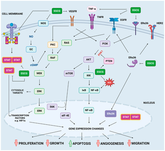 Overview of inhibitory effects of EGCG on key signaling pathways associated with the development of cancer. The details can be found in the main text of the manuscript. For the full names of the proteins, see the abbreviations section. Created with BioRender.com, accessed on 29 March 2023.