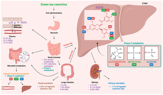Overview of EGCG’s metabolism. Based on [347,348,372,373,374]. A detailed description can be found in the main text of the article. For full names, see the abbreviations section. Created with BioRender.com, accessed on 29 March 2023.