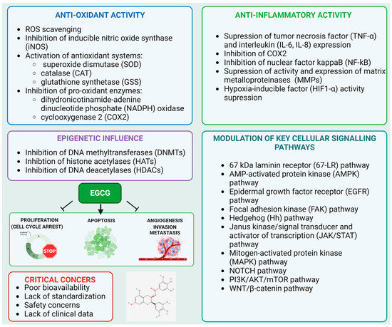 Anticancer properties of EGCG. EGCG exhibits antioxidant, anti-inflammatory, anti-proliferative, and anti-metastatic properties through the inhibition or modulation of key signaling pathways in cells and targets of epigenetic machinery. Details can be found in the main text of this article. Based on [94]. Created with BioRender.com, accessed on 29 March 2023.
