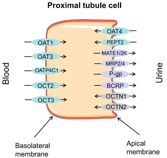 Major drug transporters in proximal tubular cells of the kidney: OAT1—organic anion transporter 1; OAT3—organic anion transporter 3; OAT4—organic anion transporter 4; OATP4C1—organic anion transporter polypeptide 4C1; OCT2—organic cation transport 2; OCT3—organic cation transport 3; PEPT2—peptide transporter 2; MATE1—multidrug and toxin extrusion protein 1; MATE2-K—multidrug and toxin extrusion protein 2 kidney-specific; MRP2—multidrug resistance-associated protein 2; MRP4—multidrug resistance-associated protein 4; P-gp—P-glycoprotein; BCRP—breast cancer-resistance protein; OCTN1—organic cation/carnitine transport 1; OCTN2—organic cation/carnitine transport 2. Efflux transporters/carriers highlighted in purple, influx carriers in blue, and bidirectional carriers in gray.