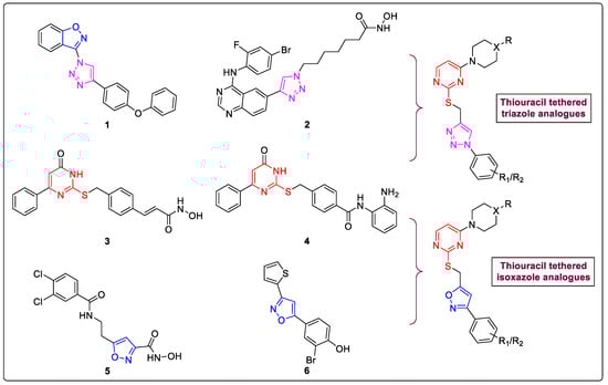 Evolution of HDACis based on a hybrid structure bearing triazole or isoxazole and thiouracil-based core heterocycles; Structures 1 and 2 represents 1,2,3-triazoles (pink), 3 and 4 represents thiouracil (red) analogues also 5 and 6 represents isoxazole (blue) derivatives as HDACis inhibitors.