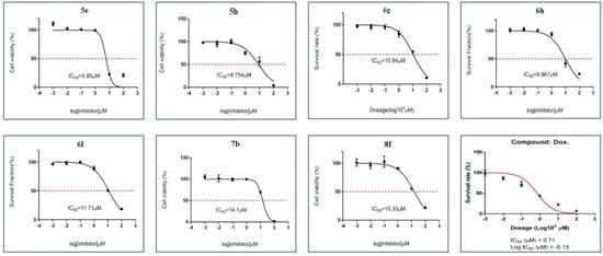 Initially, the novel thiouracil tethered triazole/isoxazole analogues were subjected to cell viability studies against human breast cancer (BC) (MCF-7) cells (Table 1), using the Alamar Blue assay [32,33,34]. For over four decades, numerous research groups have extensively utilized MCF-7, a BC cell line exhibiting a well-characterized molecular profile and dependence on estrogen, in drug development research [35,36]. The assay was performed at different concentrations (0, 0.01, 0.1, 1, 10, or 100 µM) for 72 h, and the positive control Doxorubicin inhibited the viability of MCF-7 cells with an IC50 value of 0.71 µM. The results of the assay displayed that compounds 5e, 5h, 6g, 6h, 6l, 7b, or 8f produced loss of viability of MCF-7 cells with varied IC50 values of 5.85, 8.754, 10.84, 9.867, 11.71, 14.70, or 15.33 µM, respectively (Figure 3). In addition, the active compounds are non-toxic to immortalized breast cancer cells (MCF-10A) (Supplementary Materials). Among the tested isoxazole and triazole-tethered thiouracil molecules, triazole-based compounds bearing 3,4-dichloro phenyl group in 5c, 5e, 5h, or 7b inhibited the human BC cells with an IC50 value of 11.31, 5.85, 8.754, or 14.7 uM, respectively, when compared to less active compounds that belonged to methoxy, methyl, or hydroxy-phenyl groups. Moreover, in isoxazoles molecules, those bearing methoxyphenyl-substitution in compounds 6d, 6h, 6g, or 7d were found to be cytotoxic to human BC cells, with IC50 values of 15.96, 10.84, 9.86, or 14.8 μM, respectively. On the other hand, methylphenyl-substitution-to-isoxazole-based compounds such as 6i, 6l, 7f, or 8f showed considerable IC50 values of 43.27, 11.71, 14.83, or 15.33 μM, respectively. So, the SAR data revealed that the compounds having triazole and 3,4-dichloro phenyl substitutions favored higher cytotoxicity. In contrast, the isoxazole compound and methoxy or methyl-phenyl-substitution showed better bioactivity against human BC cells.