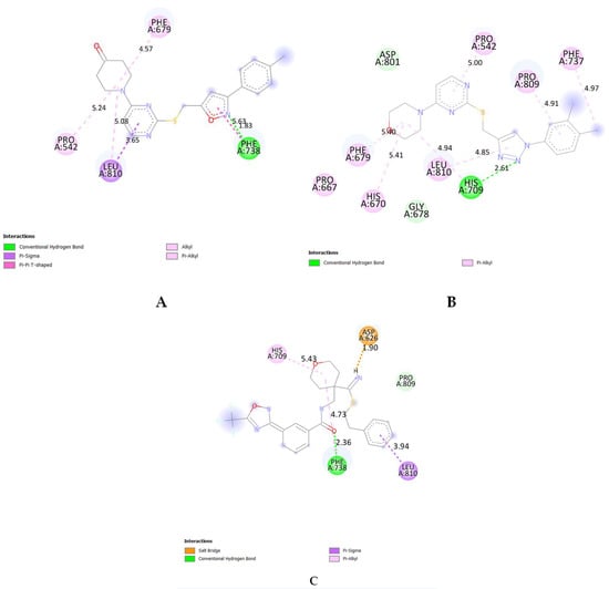 An analysis of the binding pocket revealed critical interactions for the isoxazole, triazole, and co-crystal ligands. The isoxazole compound (6l) formed hydrogen bonds with residue PHE-738 with a bond distance of 1.83 Å, stabilizing its binding within the pocket (Figure 5A). Moreover, 6l had π- sigma bond formation with the residue LEU-810 with a bond distance of 3.65 Å, and π-π T-shaped bonds formed with residue PHE-738 with a bond distance of 5.63 Å, and alkyl bond formed with residues LEU-810 and PRO-542, respectively. The triazole compound (5h) displayed hydrogen bond interactions with residue HIS-709 having a bond distance of 2.69 Å, and π-alkyl bonds were formed with residues PRO-242, HIS-670, PHE-679, PHE-737, PRO-809, and LEU-810, contributing to its strong binding (Figure 5B). The co-crystal ligand (TMP269) demonstrated hydrogen bond interactions with residues PHE-738 with a bond distance of 2.36 Å, and a π-alkyl bond formed with residues HIS-709 and PHE-738 with bond distances of 5.43 Å and 4.73 Å, respectively. Furthermore, TMP269 had a π-sigma bond and salt bridge interactions with residues LEU-810 and ASP-626, respectively (Figure 5C). These interactions play a crucial role in maintaining the stability and specificity of the ligand–protein complex.