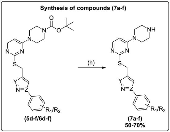To a stirred solution of compounds (5d–f/6d–f) in dichloromethane (DCM), 0.5 mL of trifluoroacetic acid was added slowly at 0–4 °C, and the reaction mixture was stirred at room temperature for 1 h [43]. After completion of the N-boc deprotection [TLC: (MeOH: EtOAc) (1:9)], the solvent was distilled off using a rotary evaporator. The residues were neutralized by a 20% K2CO3 solution, extracted with an ethyl acetate layer, and dried over Na2SO4. Then, ethyl acetate was concentrated in a rotary evaporator and recrystallized with the appropriate solvent to afford the target compounds (7a–f) (Scheme 2).