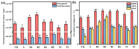 The results of the determination of the total phenol and flavonoid contents in wine are presented in Figure 1a. The experimental groups, with the exception of T1, exhibited a significant increase (p < 0.05) in total phenol content compared to control group S. The D1 and D2 groups exhibited the highest total phenol contents of 1622.46 and 1752.37 mg/L, representing significant increases relative to the control of 36.67% and 47.83%, respectively. This result can be attributed to the direct incorporation of exogenous polyphenols. Moreover, the addition of polyphenols resulted in an increased production of total phenols in wine. The impact of polyphenols on the adsorption capacity of yeast autolysate, pectinase activity, and β-glucosidase activity during fermentation affects the levels of free phenols [27]. Pastor et al. [15] found that different concentrations of resveratrol can promote the presence of other polyphenols in wine. Anaya et al. [18] also revealed a similar pattern for catechins, although no reports are currently available on the impact of DMY on the content of phenolic compounds in wine. The results of the present experiments indicate that DMY also has the ability to enhance the production of phenolic compounds in wine; moreover, the DMY-based enhancement of the total phenol content in wine is superior to that of resveratrol and catechins at the same concentrations. Dihydromyricetin and resveratrol are phenolic compounds belonging to the family of flavonoids. This is a significant contributing factor to the overall increase in the flavonoid content. Group R2 exhibited the highest concentration of flavonoids (498.35 mg/L). Furthermore, the present study revealed that SO2 had no significant impact on the overall concentrations of phenols and flavonoids (p < 0.05).