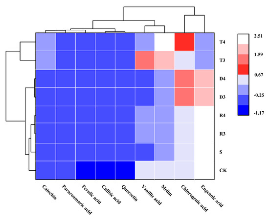 A clustering heat map was used for processing and analyzing data, by visually comparing the variations in phenolic acid content among wines classified into different groups (as shown in Figure 2). Phenolic acid, a polyphenolic compound of considerable importance found in wine, displays antioxidant characteristics and plays a role in the nutritional and health benefits associated with wine consumption. In the present study, high-performance liquid chromatography (HPLC) was employed to quantitatively assess the presence of nine common phenolic acids in various types of wine. The results showed that various phenolic antioxidants had no statistically significant influence on the concentrations of coumarinic acid, ferulic acid, caffeic acid, and quercetin. Incorporating tea polyphenols has the potential to increase the levels of catechin, chlorogenic acid, rutin, and vanillic acid, while concurrently suppressing the production of syringic acid. We also observed that DMY inhibited the production of syringic acid and promoted the production of chlorogenic acid. The impact of resveratrol on the levels of phenolic acids was found to be negligible, with the exception of an increase in the production of vanilloid acid. Garaguso et al. [29] pointed out that the use of SO2 does not affect the phenolic acid content of wine. Castellari et al. [30] reported that, owing to the antioxidant properties of sulfur dioxide, SO2-free organic wine may be oxidized in the fermentation stage of the brewing process, resulting in a lower phenolic acid content compared with traditional wine. We observed that the ferulic acid, caffeic acid, and quercetin contents were significantly lower in the CK than the S group. These results are consistent with those of Castellari.