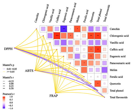 The thick line in the heat map of the correlation network of total phenols, total flavonoids, and phenolic acids was used to indicate the degree of correlation, and the color was used to indicate significance. In general, we did not think the correlation was statistically significant until p < 0.05. Results of a paired-sample t-test based on phenolic acid content. Red and blue asterisks denotepositive correlation and negative correlation, respectively (paired-sample t-test: *, p < 0.05; **, p < 0.01; ***, p < 0.001).