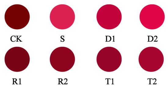 The de* value represents the color difference between a sample and the standard, with higher values denoting a larger difference. The interaction between polyphenols and anthocyanins via molecular stacking, hydrogen bonding, and other mechanisms creates stable compounds that preserve the food color [35]. The experimental groups exhibited lower de* values compared with the CK group, and a reduced color difference relative to the S group. Furthermore, it was observed that in the concentration experimental design, an increase in polyphenol concentration resulted in a decrease in the de* value. The group supplemented with DMY (D2) exhibited the lowest de* value, and its chromatic difference with group S was minimal. The chromaticity diagram in Figure 4 reveals that, after a 3-month aging period, the wines in the S, D1, and D2 groups retained a violet–red hue, whereas those in the remaining groups exhibited a darker coloration, with a brown–black tone.