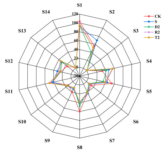 To investigate the sensory differences among different types of wine, we employed an electronic nose and an electronic tongue to analyze the specimens. Olfactory radar profiles for various wine samples were determined using the obtained sensor responses. The S2 (hydrogen sulfide) and S12 (sulfide) groups exhibited weaker responses in the absence of antioxidants or added plant-derived polyphenols compared to the S group (Figure 6). As shown in the analyses discussed in the previous sections, polyphenols derived from plants have the potential to reduce the levels of volatile mercaptans, especially for 3-methylthiopropanol, which could be associated with the reactions of the S2 and S12 probes. The S11 (aromatic compounds) probe exhibited the highest response within the T2 group and the second highest response within the D2 group. It was discovered in this investigation that group R2 had the strongest impact on the enhancement of the alcohol ester aroma in wine. Nonetheless, the aforementioned regulation did not reappear during the identification process carried out by the S11 probe.