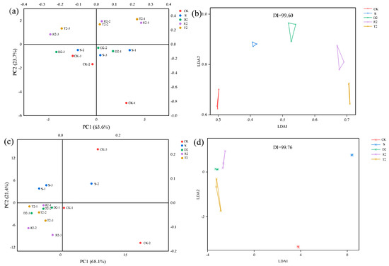 The results of the discriminant factor analysis (DFA) indicated that the discrimination index (DI) was 99.76 (Figure 7). The samples exhibited a minimal overlap, suggesting a significant difference in odor among the groups. This observation is consistent with the results of the PLS-D analysis presented in Figure 6. Principal component analysis (PCA) was conducted on the signal data of 14 probes to draw a two-dimensional diagram of the electronic nose response. Both group T and group R occupied two quadrants and exhibited a degree of similarity in their olfactory perception (Figure 7). The analysis suggests that the use of plant-derived polyphenols may enhance the production of alcohol esters, ultimately leading to an improved wine aroma. However, the PCA of group D2 highlighted a similarity to groups S and CK. These findings suggest that the olfactory perception of wine is not solely contingent upon the presence of specific volatile compounds; instead, there is a complex interplay among these compounds that synergistically contributes to the overall aroma profile of wine.