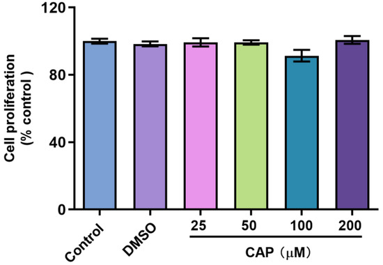 Effect of capsaicin on the proliferation of HepG2 cells. HepG2 cells were treated with capsaicin (25 μM, 50 μM, 100 μM, 200 μM in DMSO) for 24 h. The proliferation ratios of HepG2 cells were analyzed by the CCK-8 assay. The control group was treated with DMSO or DMEM alone. The data shown are the mean ± SD (Standard Deviation) of three independent experiments.