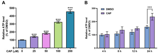 Adenosine triphosphate (ATP) was assessed by the firefly bioluminescence of an ATP assay kit (Beyotime, Shanghai, China). HepG2 cells were seeded into a 6-well plate at a density of 1.0 × 105 cells/well and then cultured to reach 80% confluence. The cells were pretreated with capsaicin at various concentrations (25, 50, 100 and 200µM dissolved in DMSO) and for different times (4 h, 8 h, 12 h and 24 h). They were then collected and lyophilized with 200 μL of an ice-cold ATP extraction buffer for 5 min. The suspension was scraped and then transferred into a microcentrifuge tube. Cell debris were removed by centrifugation at 12,000× g and 4 °C for 5 min. The supernatant was collected for further determination of intracellular ATP content using an ATP assay kit (Beyotime Biotechnology, Shanghai, China). The luminescence of an 80 µL sample with 100 µL of ATP detection buffer was assayed in a liquid scintillation counter (1450, PerkinElmer, Billerica, MA, USA). The ATP level was calculated from the ATP standard curve.