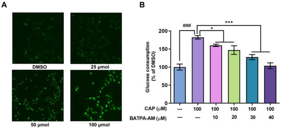 Ca2+ was involved in the capsaicin-induced glucose metabolism increase in HepG2 cells. (A) HepG2 cells were treated with different concentrations of capsaicin (25, 50 and 100 μM) for 24 h. The intracellular Ca2+ was detected by measuring the fluorescence intensity of the calcium indicator Fluo-3AM with fluorescence microscopy. (B) The glucose consumptions of HepG2 cells after treatment with capsaicin alone or capsaicin and BATPA-AM (a calcium-chelating agent) were measured using a glucose assay kit (* p < 0.05, *** p < 0.001 vs. CAP 100 μM; ### p < 0.001 vs. control).