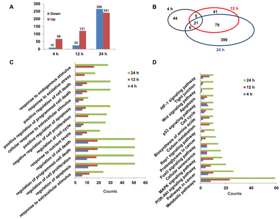 Transcriptomic changes in HepG2 cells exposed to capsaicin. (A) Summary of up-/down-regulated DEGs numbers between capsaicin-treated groups and the control groups at different times (4 h, 12 h and 24 h). (B) The Venn diagram shows an overlap of DEGs between different capsaicin-treated times (4 h, 12 h and 24 h). (C) The DEGs of HepG2 cells at different capsaicin-treated times (4 h, 12 h and 24 h) were enriched in 14 GO terms. (D) The DEGs of HepG2 cells at different capsaicin-treated times (4 h, 12 h and 24 h) were mapped in KEGG pathways. Pathways including at least 3 mapped proteins were considered.