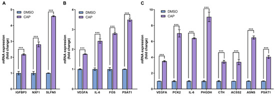 Real-time PCR analysis of differentially expressed genes. (A) At the 4 h-capsaicin-treated group, the mRNA expression of IGFBP3, NXF1 and SLFN5 were selected to be validated by real-time PCR. (B) At the 12 h-capsaicin-treated group, the mRNA expression of VEGFA, IL-6, FOS and PSAT1 were selected to analyzed by real-time PCR. (C) At the 24 h-capsaicin-treated group, the mRNA expression of VEGFA, IL-6, PCK2, PHGDH, CTH, ACSS2, ASNS and PSAT1 were selected to be analyzed by real-time PCR (*** p < 0.001 vs. DMSO).