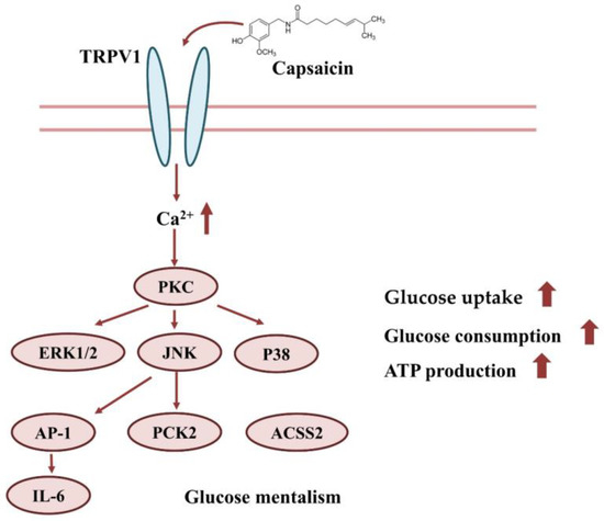 In conclusion, capsaicin may interact with TRPV1 on the surface of HepG2 cells, which induces the inward flow of calcium ions. The Ca2+ signal further activates signal pathways, such as PI3K/AKT, MAPK/ERK, etc. This eventually leads to increases in glucose uptake, consumption and ATP production (Figure 8).