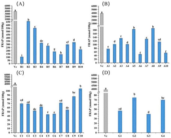 Total antioxidant capacity assessment of the 34 edible flower samples, using the parameter of FRAP. (A–D) Total antioxidant capacity of flower samples from families Rosaceae, Asteraceae, Caryophyllaceae and Gentianaceae, respectively. Vitamin C was a positive control. Different lowercase letters indicate statistically significant differences in the FRAP values of flower samples within the same family, p < 0.05.