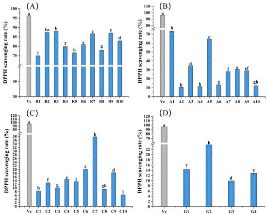 DPPH scavenging rates of the 34 edible flower samples. (A–D) DPPH scavenging rates of flower samples from the families Rosaceae, Asteraceae, Caryophyllaceae and Gentianaceae, respectively. Vitamin C was a positive control. Different lowercase letters indicate statistically significant differences in the values of flower samples within the same family, p < 0.05.