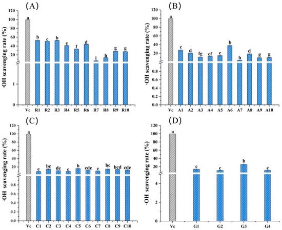 ·OH scavenging rates of the 34 edible flower samples. (A–D) ·OH scavenging rates of flower samples from the families Rosaceae, Asteraceae, Caryophyllaceae and Gentianaceae, respectively. Vitamin C was a positive control. Different lowercase letters indicate statistically significant differences in the values of flower samples within the same family, p < 0.05.