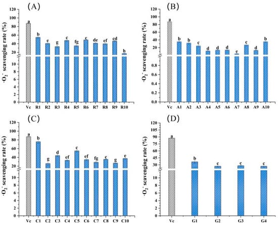 ·O2− scavenging rates of the 34 edible flower samples. (A–D) ·O2− scavenging rates of flower samples from family Rosaceae, Asteraceae, Caryophyllaceae and Gentianaceae, respectively. Vitamin C was a positive control. Different lowercase letters indicate statistically significant differences in the values of flower samples within the same family, p < 0.05.