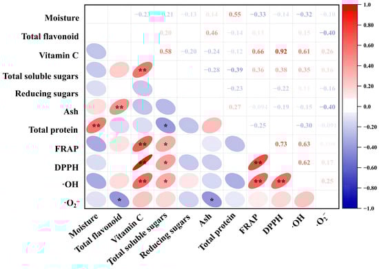 Pearson correlation analysis of nutrient and antioxidant indices of the 34 edible flower samples. Ellipse in color indicates the correlation between 2 indicators that distributed on the vertical and horizontal axes, respectively. The transition of shape and color of ellipse from round to flat and from blue to red indicates an increase in the correlation; * and ** denote significant correlation at the levels of p < 0.05 and p < 0.01, respectively.