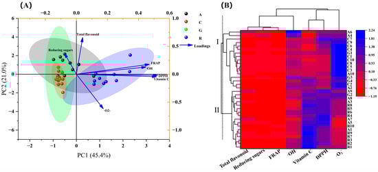 Principal component analysis (A) and cluster analysis (B) of the comprehensive quality of the 34 edible flower samples. In (A), 4 corresponding colors for A, C, G and R represent flower samples of Asteraceae, Caryophyllaceae, Gentianaceae and Rosaceae, respectively. (B) shows the cluster analysis conducted using the parameter of “Manhattan distance 2.5” in the tool of “heat map with Dendrogram” provided by the software Origin 2021. These 34 edible flower samples were classified into 2 major categories, Ⅰ and II.