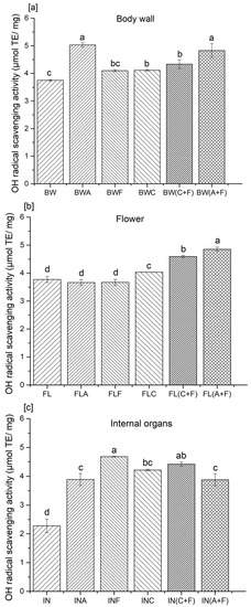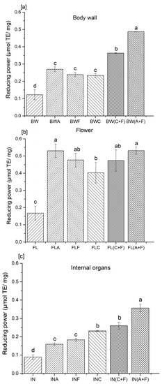 The ferric-reducing antioxidant power assay is often used to determine the ability of natural antioxidants to donate electron or hydrogen atoms [17]. This assay is categorized under the single electron transfer (SET)-based method, which involves reducing higher valency elements to their lower valence state. In particular, the reduction of the ferric ion (Fe3+)–ligand complex to the ferrous (Fe2+) complex is monitored with the absorbance at 700 nm [21]. Previous studies have demonstrated a direct correlation between the reducing power and antioxidant activity of protein hydrolysates [13]. Most non-enzymatic antioxidant activities are mediated through redox reactions, including reducing power. Antioxidative peptides in protein hydrolysates have the ability to reduce the Fe3+/ferric cyanide complex to the ferrous form. In this study, the reducing power was varied, from 0.12 to 0.48, 0.08 to 0.35, and 0.16 to 0.53 μmol of Trolox/mg of proteins in the body wall, internal organs, and flower hydrolysates, respectively (Figure 2).
