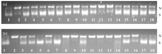 Agarose gel electrophoresis of the inhibition of hydroxyl radical- (a) and peroxyl radical-s (b) induced DNA scission by hydrolysates from the body wall (BW), internal organs (IN), and flower (FL) of sea cucumber. N—Nicked DNA; S—Supercoiled DNA; 1—Blank; 2—Control; 3—BWA; 4—BWF; 5—BWC; 6—BW(C+F); 7—BW(A+F); 8—INA; 9—INF; 10—INC; 11—IN(C+F); 12—IN(A+F); 13—FLA; 14—FLF; 15—FLC; 16—FL(C+F); 17—FL(A+F); and 18—Carnosine.