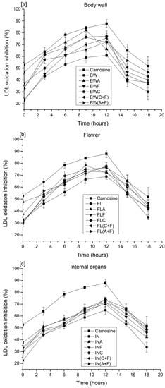 Figure 4 shows the inhibition of copper-induced LDL oxidation by carnosine and sea cucumber protein hydrolysates over 18 h of incubation at 37 ºC. Inhibition of LDL cholesterol oxidation of carnosine ranged from ~53 to ~88%. The inhibitory activity of protein hydrolysates prepared from the body wall ranged from ~23 to ~82%, whereas the inhibitory activity of hydrolysates prepared from the flower was ~30 to ~79%. The highest inhibition observed from protein hydrolysates prepared from internal organs was ~74% after 12 h of incubation, when hydrolysates were prepared using Alcalase and Flavourzyme. Carnosine exhibited the highest efficacy in inhibiting cupric ion-mediated LDL oxidation (87%) after 12 h, while the untreated counterparts of sea cucumber samples showed the lowest inhibitory activity in all three groups (BW, FL, and IN). Protein hydrolysates from each group showed strong inhibitory activity against LDL oxidation compared to the untreated samples. This could be due to the chelating ability and free radical scavenging activity of peptides present in the protein hydrolysates [6]. Kittiphattanabawon et al. [27] reported that gelatin hydrolysates prepared from blacktip shark gelatin inhibited human LDL oxidation by 8-39%. Amino acid composition plays a vital role in preventing LDL oxidation. The availability of amino acid residues, including tyrosine, histidine, phenylalanine, methionine, glycine, proline, or leucine, may enhance the chelating and radical scavenging activities of peptides. Park et al. [31] further explained that peptides containing these amino acids render stronger antioxidant activity against lipid peroxidation than do individual amino acids. A recent study about the influence of peptide charge on the inhibition of LDL oxidation revealed that the positively charged peptide fractions possess significantly higher inhibitory activity than the negatively charged fractions do [29]. The effectiveness of amino acid charge on the inhibition of LDL oxidation was observed by Wang et al. [32]. These authors suggested that peptides with negatively charged amino acids could prolong the lag time of LDL oxidation. However, the negatively charged amino acids could also chelate metal ions and may be involved in terminating the free radical chain reaction, as well as in preventing the propagation of LDL oxidation [33]. The highest inhibitory activities were observed in the protein hydrolysates treated with a combination of enzymes (Alcalase + Flavourzyme and Corolase + Flavourzyme). Similar inhibitory activity against LDL oxidation was reported for date seed protein hydrolysates [26]. The authors noted that lipophilic antioxidants might extend the LDL oxidation lag phase induced by metal ions. Nevertheless, the exact mechanism of LDL oxidation inhibition by protein hydrolysates is not yet fully understood. To date, this is the first study performed that evaluates the potential inhibitory activity of LDL oxidation for sea cucumber protein hydrolysates; thus, a direct relationship with other sea cucumber species is not feasible.