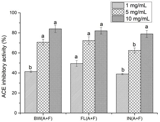 ACE-inhibitory activity (%) of sea cucumber protein hydrolysates (BW—body wall; FL—flower, and IN—internal organs, using A+F—combination of Alcalase and Flavourzyme). Different letters for the same concentration of all hydrolysates indicate significant differences at p < 0.05.
