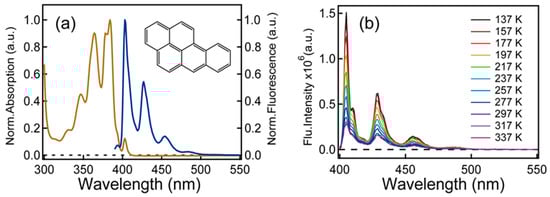 (a) Normalized steady-state absorption and fluorescence emission spectra of benzo[a]pyrene in acetonitrile. (b) Temperature-dependent emission spectra of benzo[a]pyrene in 2-MeTHF under air-saturated condition.