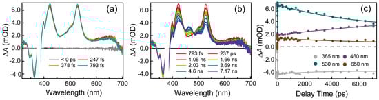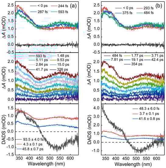 Femtosecond TA spectra were obtained using a femtosecond TA spectrometer (Helios, Ultrafast systems, Sarasota, FL, USA) [30,31,32]. The fundamental beam with a central wavelength of 800 nm, 90 fs pulse, and a repetition rate of 1 kHz, was generated by a Ti:sapphire laser system (Astrella, Coherent). Then, a fraction of the fundamental beam was used to produce a specific wavelength pump beam via an optical parametric amplifier (OPerA Solo, Coherent Inc., Santa Clara, CA, USA). Another part of the fundamental beam passed through a delay line and then focused on CaF2 or sapphire crystal to generate a white light continuum (WLC) probe beam. Nanosecond TA data were measured using a TA spectrometer (Helios-EOS fire, Ultrafast System, Sarasota, FL, USA). The pump beam was derived from the same Ti:sapphire amplifier as the femtosecond experiment. The WLC probe beam was generated from a photonic crystal fiber broadband probe source. TA spectra were analyzed by Igor Pro program version 6.21, OriginPro 2017C and Glotaran program version 1.5.1 [33].