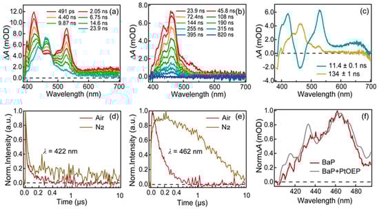 (a,b) Nanosecond transient absorption spectra of benzo[a]pyrene in acetonitrile upon 380 nm excitation. (c) Decay-associated difference spectra (DADS) extracted from global fitting of transient absorption data for benzo[a]pyrene in acetonitrile. Representative kinetic traces at specified probe wavelengths of benzo[a]pyrene under (d) air- and (e) N2-saturated conditions, respectively. (f) Comparison of the spectral shape of DADS2 of a benzo[a]pyrene monomer with the final spectral shape of benzo[a]pyrene and PtOEP mixture.