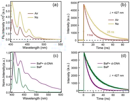 Figure 5a,b exhibits emission spectra and kinetics at 427 nm of benzo[a]pyrene under air- and N2-saturated conditions. It is clear that both the emission intensity and lifetime of benzo[a]pyrene are significantly quenched in the presence of oxygen. Furthermore, a comparison of the steady-state fluorescence emission spectra and the fluorescence kinetics of benzo[a]pyrene in the presence and absence of ct-DNA are displayed in Figure 5c,d, respectively. It is clear that the addition of ct-DNA results in a 7 nm red-shift of the fluorescence emission peak compared to benzo[a]pyrene monomer. In addition, the fluorescence decay of benzo[a]pyrene itself can be well-fitted by a mono-exponential function, yielding a lifetime of 11 ± 0.1 ns. However, after adding ct-DNA, it is now required a three-exponential function to fit the kinetics perfectly and the lifetimes are 0.38 ± 0.2 ns, 2.1 ± 0.1 ns and 8.2 ± 0.1 ns, respectively.