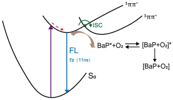 Meanwhile, it can be estimated that the collision time between oxygen and benzo[a]pyrene through diffusion is approximately 13.6 ns based on the solubility of oxygen in acetonitrile and the diffusion rate constant [21]. As the lifetime of the emissive singlet state of benzo[a]pyrene is 25 ns in nitrogen-saturated conditions, it is highly possible that the singlet excited state of benzo[a]pyrene can be quenched by oxygen. Actually, similar phenomena have also been reported in molecules such as fluorescein, pyrrolidine B and pyrrodine Y [21,22,23]. Moreover, fluorescence lifetimes and intensity of molecules similar to benzo[a]pyrene (naphthalene, phenanthrene, chrysene and pyrene) in cyclohexane solution were reported to be dependent on the oxygen concentration [24]. In addition, as shown in Figure S2, the absorption spectra before and after deoxygenation barely change and they also match well with the fluorescence excitation spectra. These results also exclude the possibility of the ground state of BaP forming a complex with oxygen resulting in the static quenching of fluorescence. Thus, we believe that the reaction between benzo[a]pyrene and oxygen takes place in the excited state rather than in the ground state, leading to the observed fluorescence quenching effect.