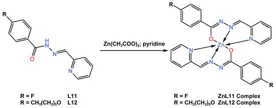 Molecular structure of ligands L11 and L12, as well as their corresponding Zn (II) complexes ZnL11 and ZnL12, reported by Diana et al. (2019) [51].